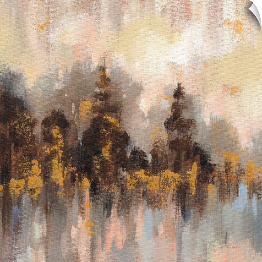<p>Contemporary artwork featuring short vertical brush strokes to create an abstract forest.</p>