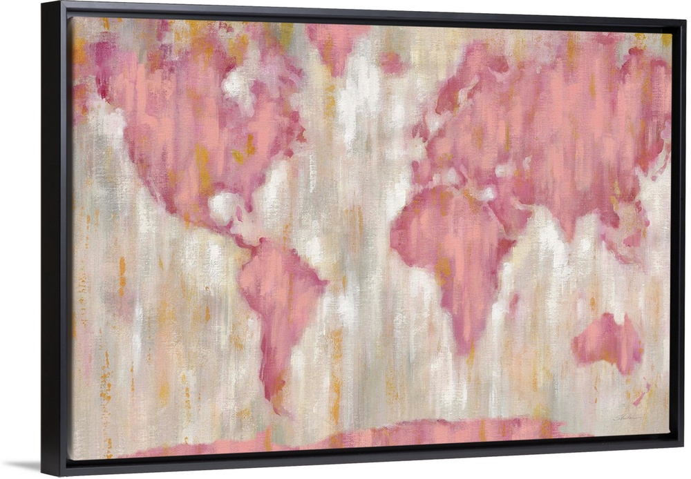 <p>Contemporary artwork of a world map with vertical brush strokes in pink and gold over a mottled background.</p>