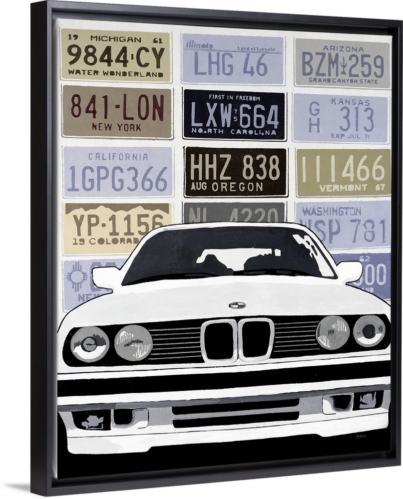 <p>Muted contemporary artwork of a luxury car on a background made of license plates from different states.</p>