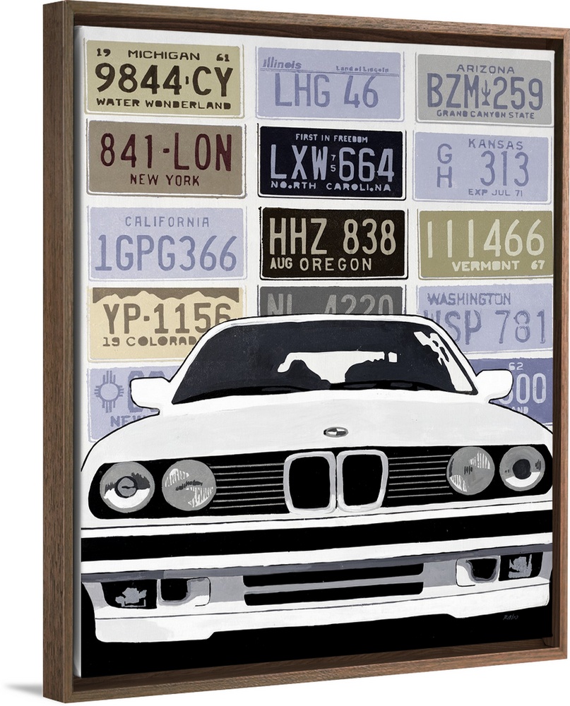 <p>Muted contemporary artwork of a luxury car on a background made of license plates from different states.</p>