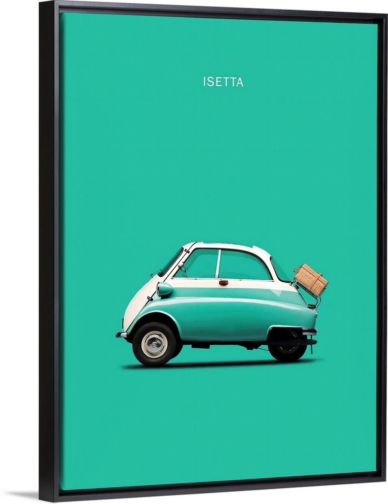<p>Photograph of a teal BMW Isetta 300 printed on a teal background</p>