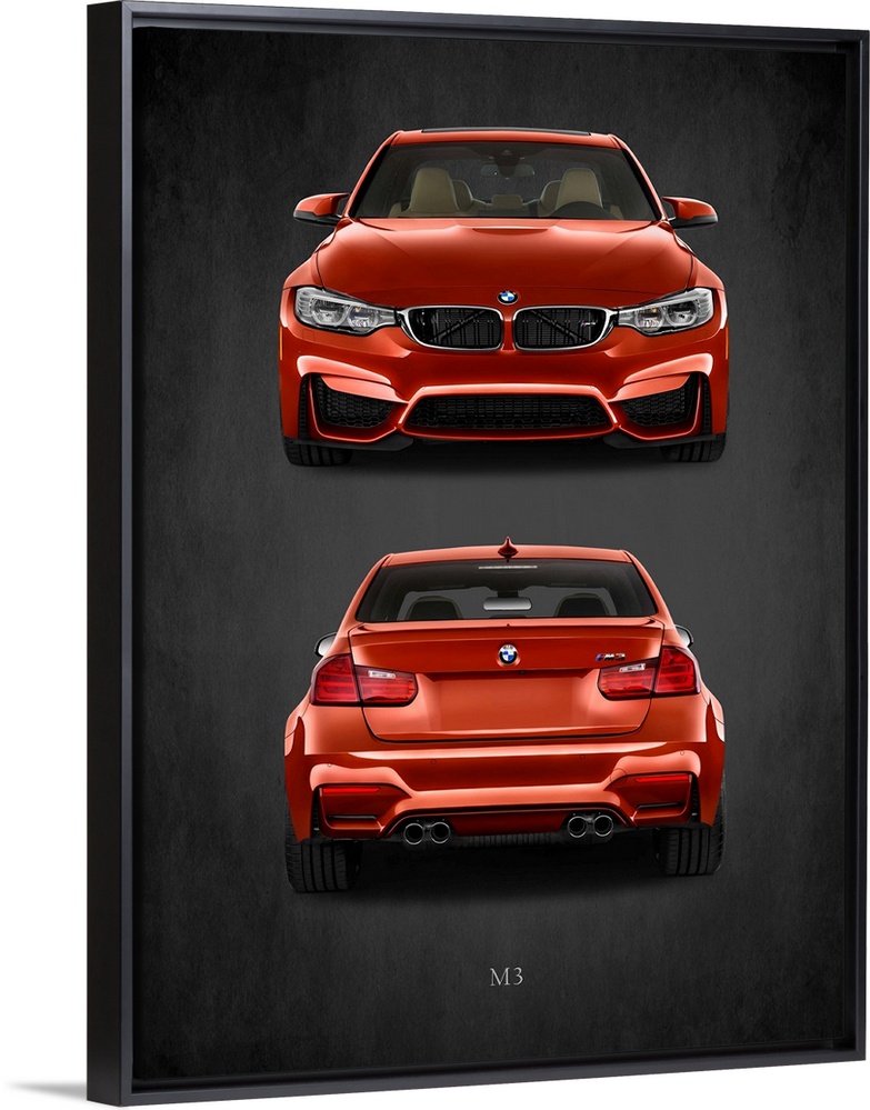 <p>Photograph of the front and back of an orange-red BMW M3 printed on a black background with a dark vignette.</p>