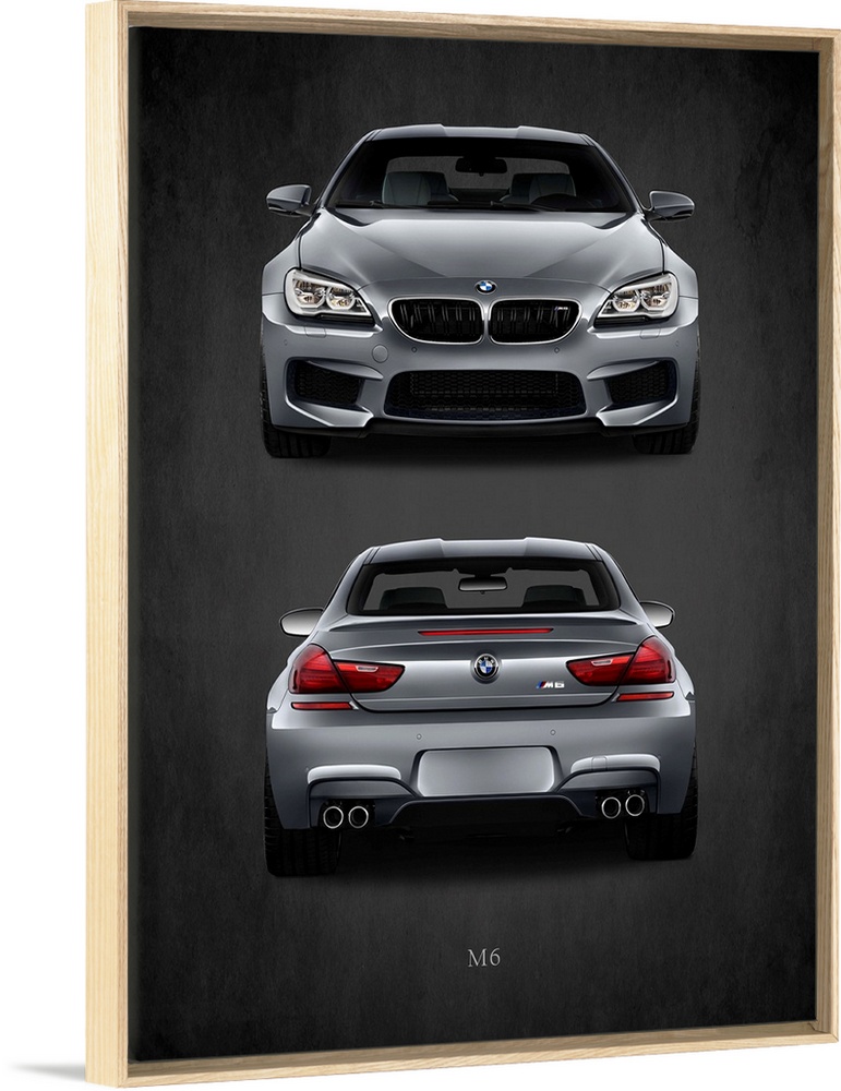 <p>Photograph of the front and back of a silver BMW M6 printed on a black background with a dark vignette.</p>