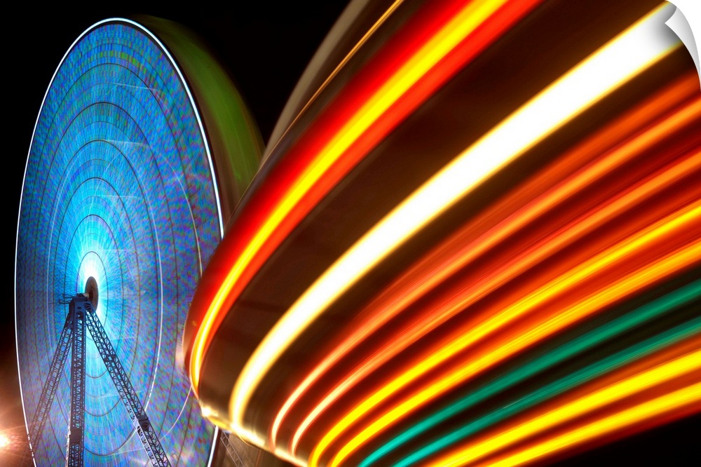 <p>USA, New Jersey, Seaside Park, Light trails from ferris wheel and rides Boardwalk amusement park lights at night at Funtown Pier</p>