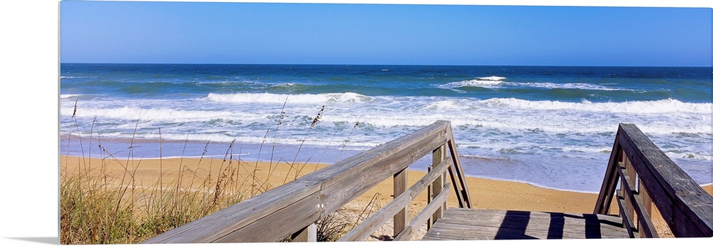 <p>Panoramic photo of a wooden walkway leading to a beach shore with crashing waves during the day.</p>