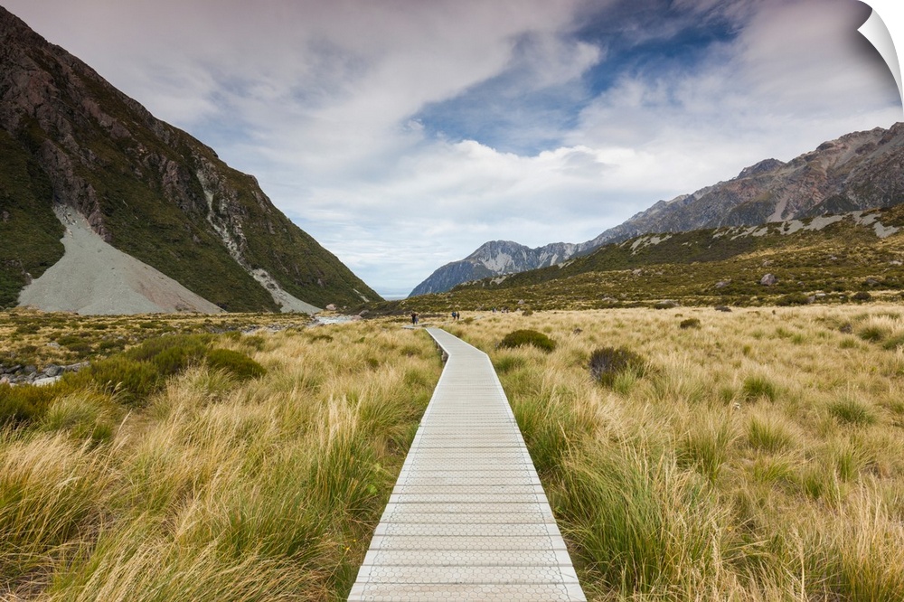 <p>Boardwalk on landscape, hooker valley track, aoraki/mount cook national park, canterbury, south island, new zealand.</p>