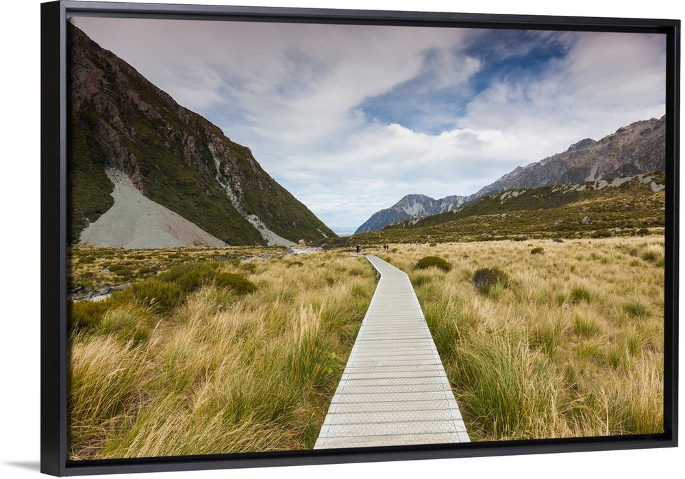 <p>Boardwalk on landscape, hooker valley track, aoraki/mount cook national park, canterbury, south island, new zealand.</p>