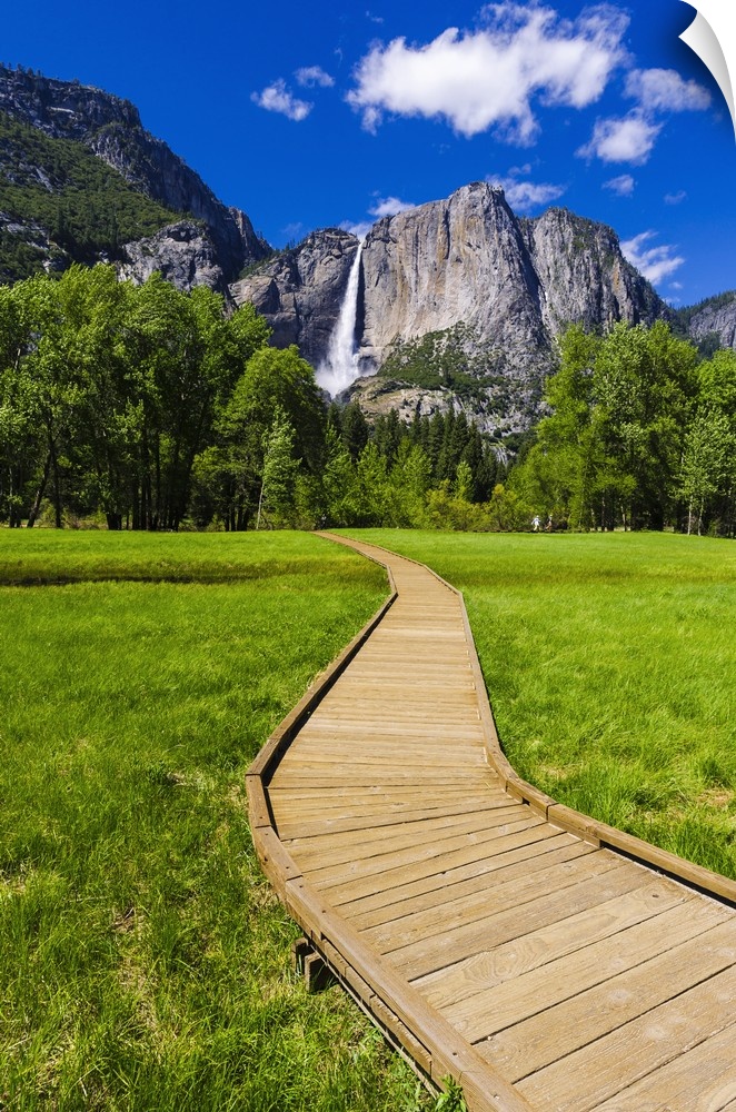 <p>Boardwalk through meadow under Yosemite Falls, Yosemite National Park, California USA</p>