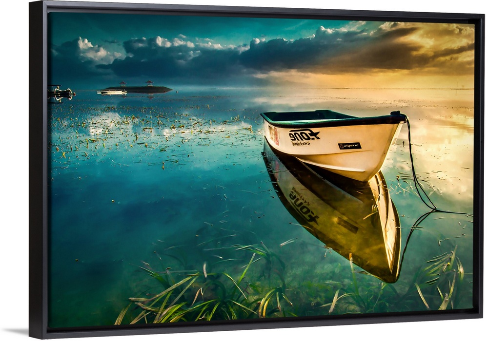 <p>A lone row boat lays still in flat reflective water casting perfect reflection.</p>