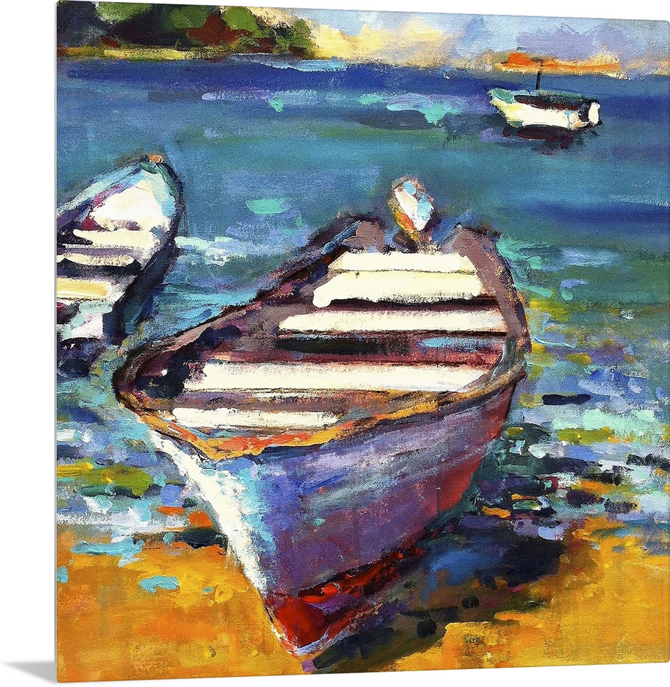 <p>A coastal themed painting of a row boat sitting on the shore of a tropical beach.</p>