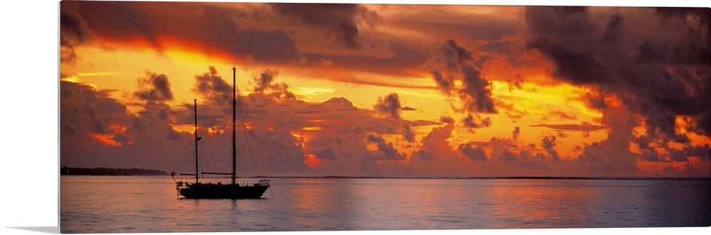 <p>Single ship with two tall masts on calm waters against a backdrop of dramatic fiery clouds at dusk.</p>