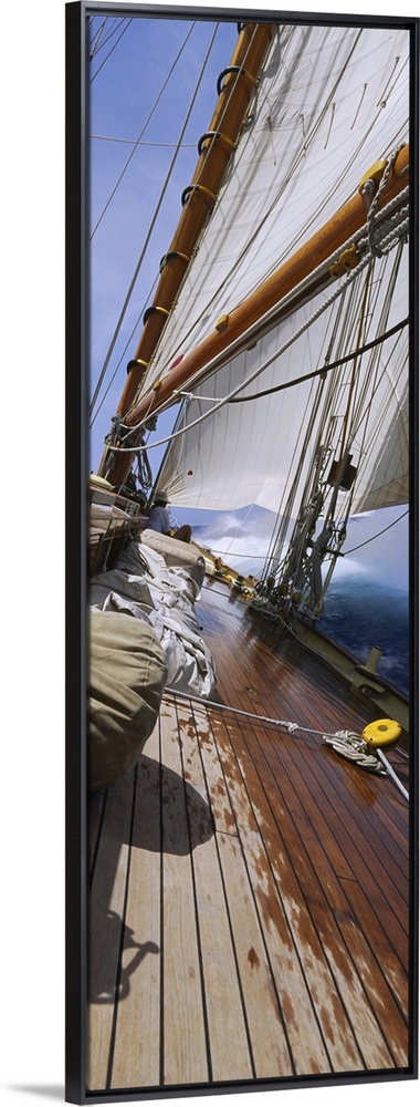 <p>Vertical panorama of the deck of a sail boat as it tips starboard in water with the sails at full mast.</p>