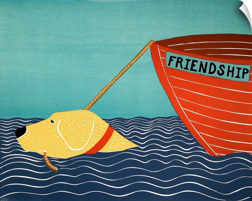 <p>Illustration of a yellow lab swimming the the ocean pulling a red boat called "Friendship" behind him.</p>