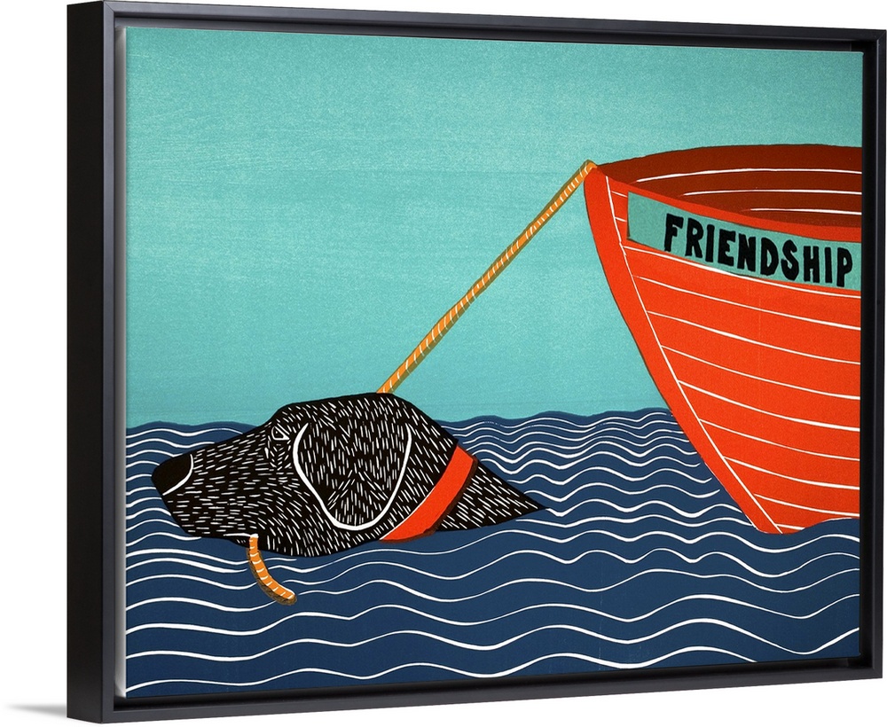 <p>Illustration of a black lab in the ocean pulling a bot behind him with the name "Friendship"</p>