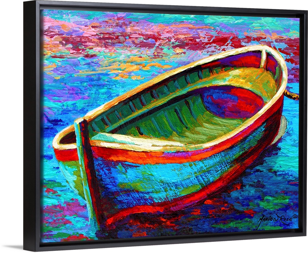 <p>Big canvas painting of a boat floating in water represented by a lot of different colors.</p>