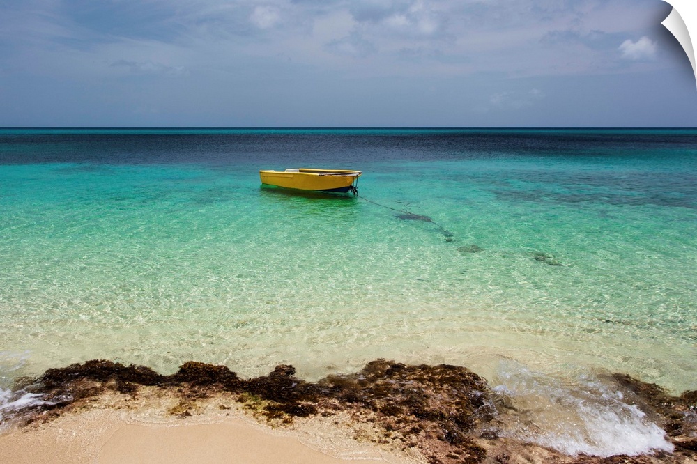 <p>A lone boat in the turquoise water off a tropical island, Frederiksted, St. Croix, Virgin Islands, United States of America.</p>
