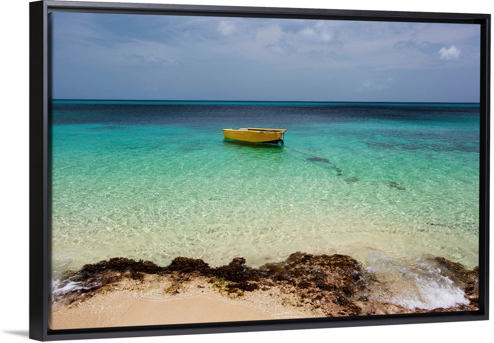 <p>A lone boat in the turquoise water off a tropical island, Frederiksted, St. Croix, Virgin Islands, United States of America.</p>