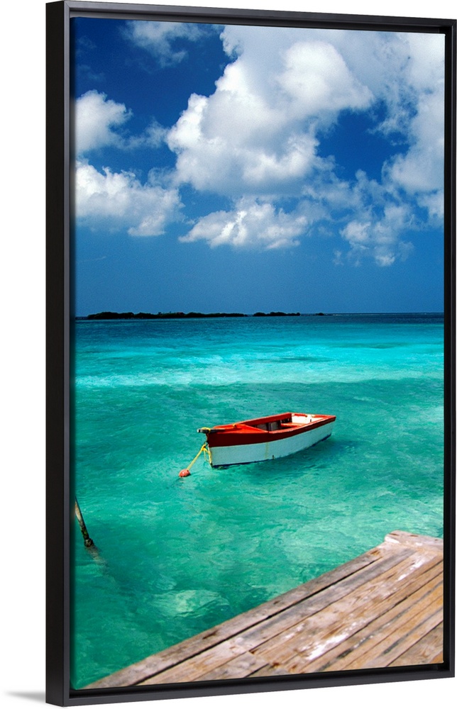 <p>Huge photograph centers on a small water vessel sitting docked in the crystal clear waters next to an island within the Caribbean Sea.</p>