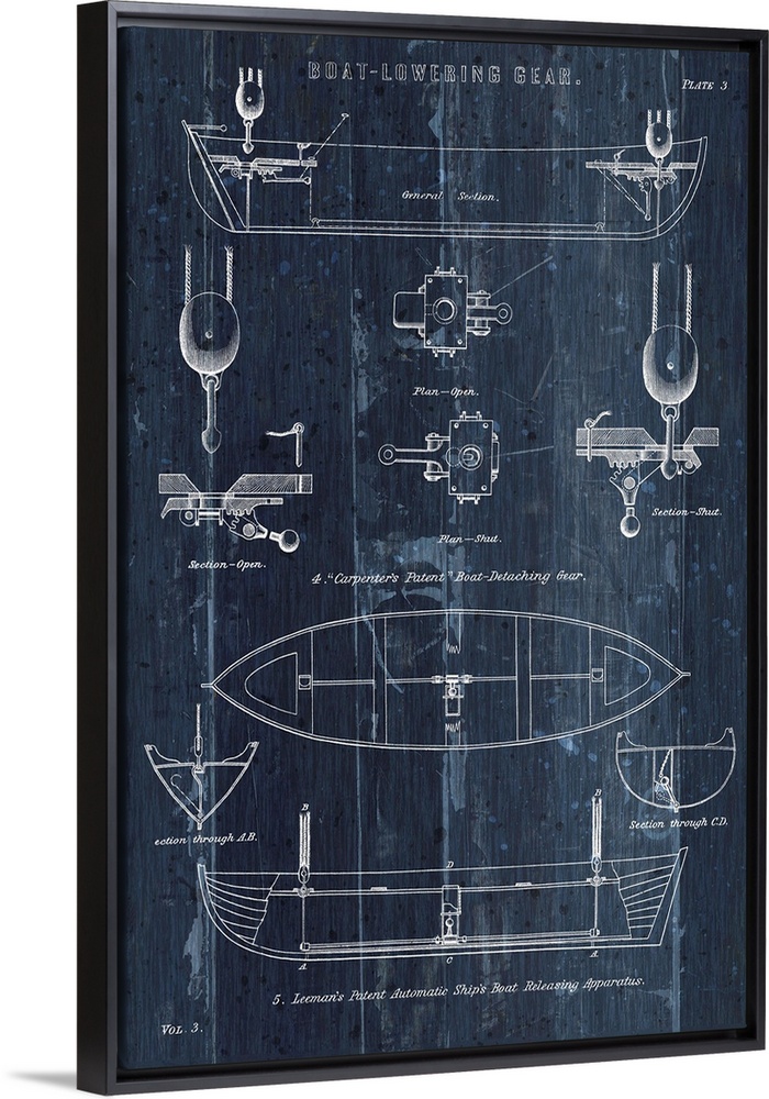 <p>Blueprint plans of a boat with close up of various parts.</p>