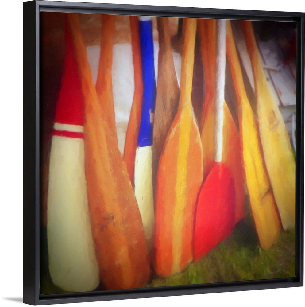 <p>Square contemporary painting of bright, colorful boat oars leaning together.</p>