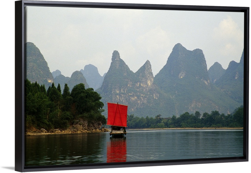 <p>A small boat in a Chinese river is photographed in front of immense cliffs.</p>