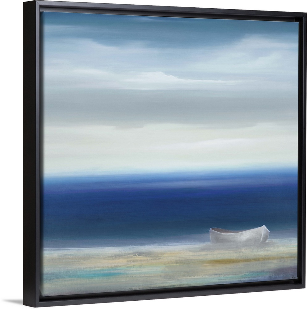 <p>Painting of a row boat sitting on the shore looking out at vast calm sea.</p>