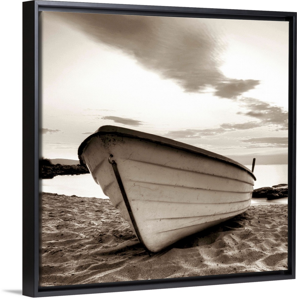 <p>A square image of a small white boat pulled up onto a sandy beach with a dramatic line of clouds above.</p>