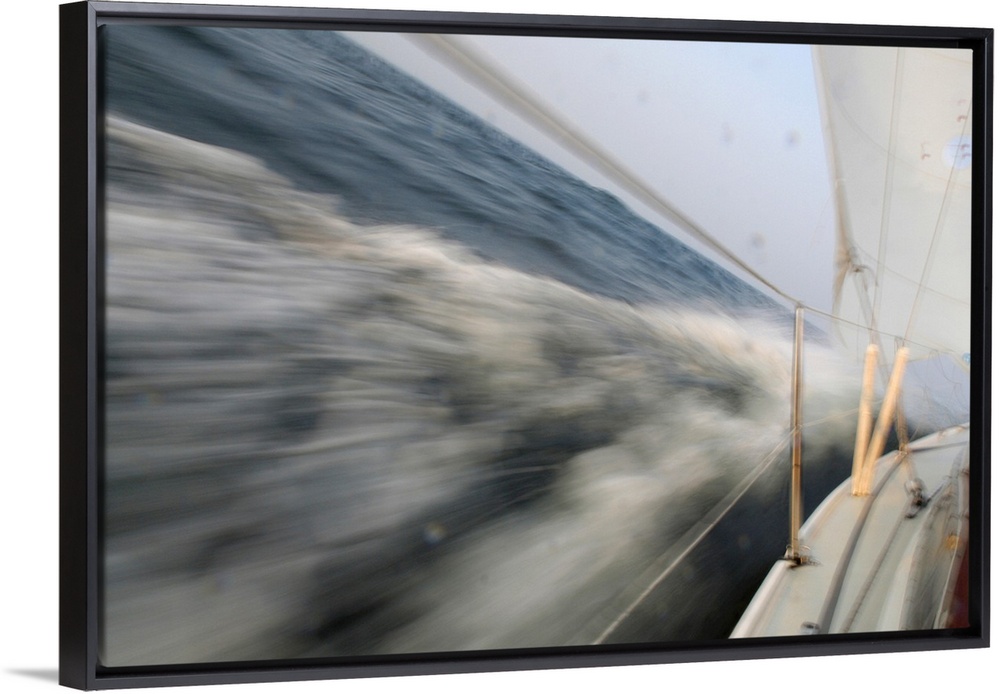 <p>Action photo from the deck of a sailboat leaning into the ocean as it makes a sharp, fast turn.</p>