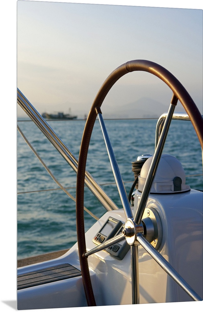 <p>Up-close photograph of steering wheel on sailboat with the ocean in the background.</p>