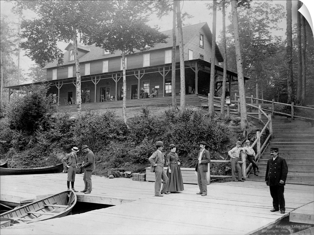 <p>Boaters vacationing in the Adirondack Mountains talk on the pier at the Raquette Lake Hotel. Ca. 1889. | Location: Raquette Lake Hotel, Adirondack Mountains, New York, USA.</p>