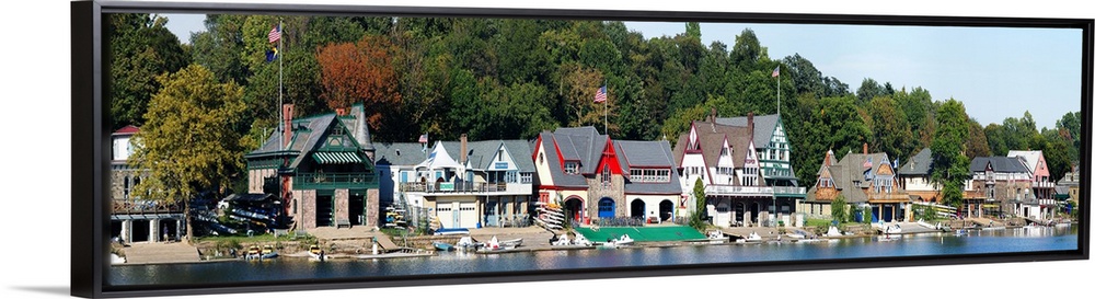 <p>A panoramic photograph taken at midday in late summer of the boat houses that line the river.</p>