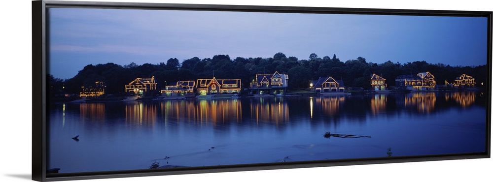 <p>Panoramic photo of Boathouse Row in Philadelphia, Pennsylvania (PA) at sundown. Lights on the houses are reflected in the water.</p>