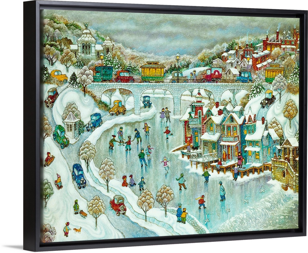 <p>A winter scene of row houses surrounding a body of water with skaters on the water.</p>