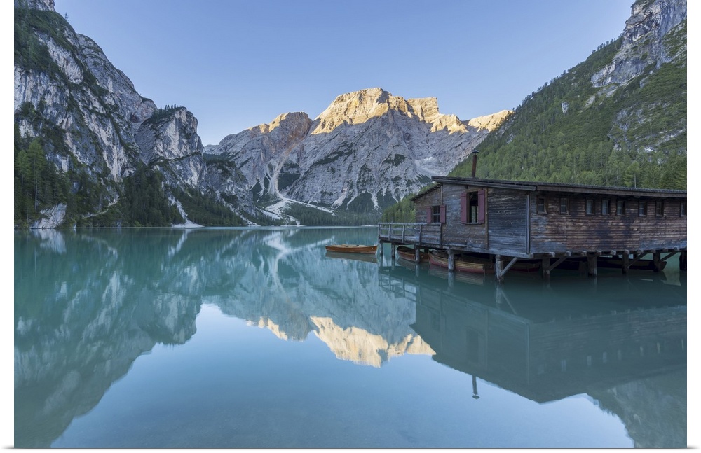 <p>Boathouse with Croda del Becco (Seekofel) reflected in Braies Lake (Lago di Braies) in the Bolzano Province (South Tyrol) Dolomites, Italy</p>