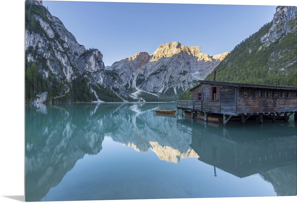 <p>Boathouse with Croda del Becco (Seekofel) reflected in Braies Lake (Lago di Braies) in the Bolzano Province (South Tyrol) Dolomites, Italy</p>