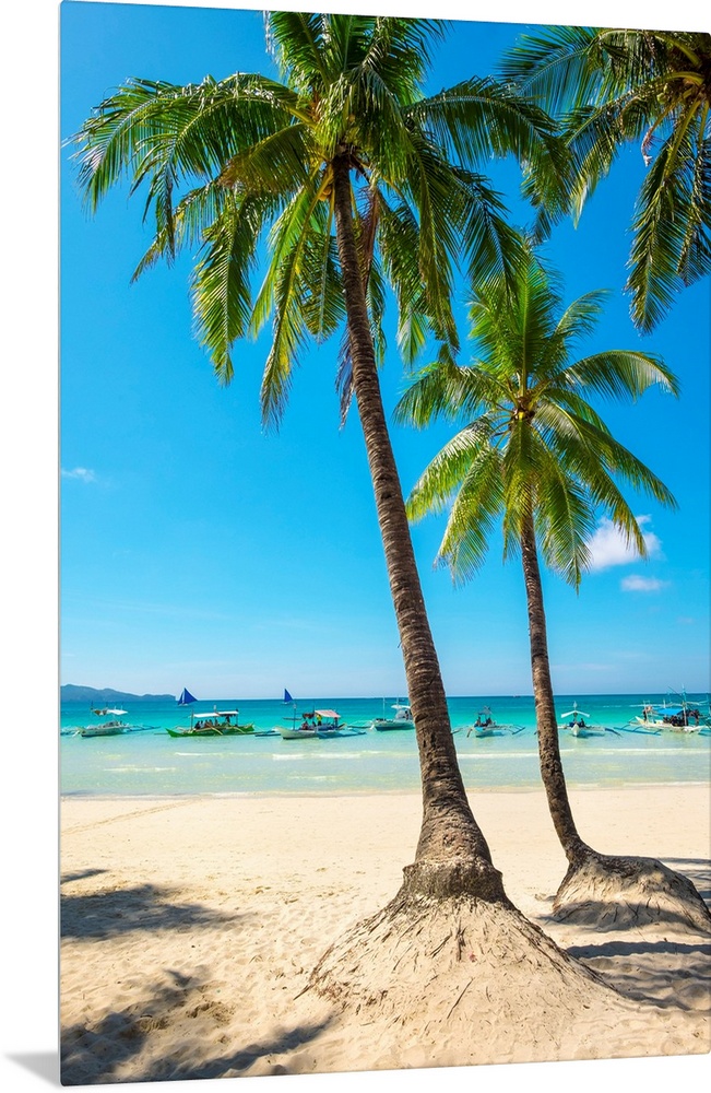 <p>Boats and palm trees on White Beach, Boracay Island, Aklan Province, Western Visayas, Philippines.</p>