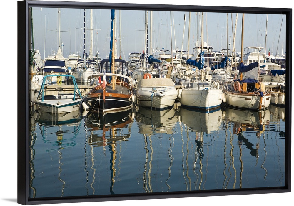 <p>Boats and reflections in the marina area of Beaulieu sur Mer. on the coastline in the South of France.</p>