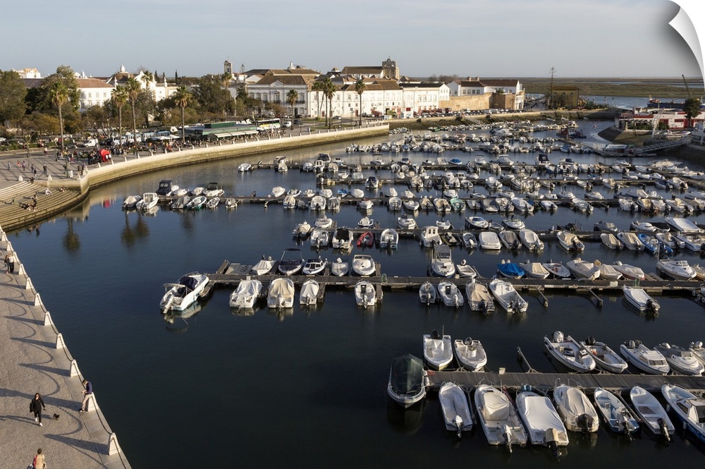 <p>Boats at moorings in the evening inn the marina in the harbour at Faro, Algarve, Portugal, Europe</p>