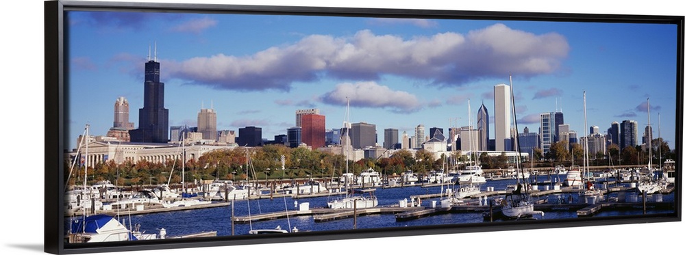 <p>The Chicago skyline is a backdrop to a wide angle photograph taken of the harbor with several boats docked in the water.</p>