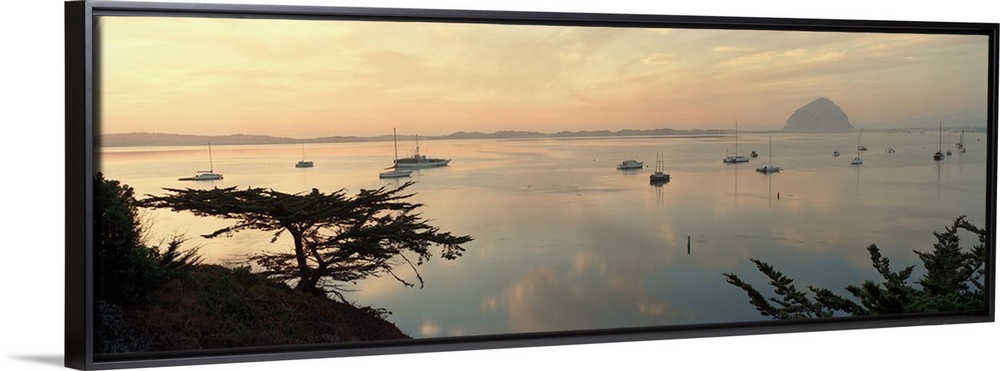 <p>Wide angle photograph on a big canvas looking over a hillside at many small boats in the still waters of Morro Bay, as the sun sets over California.</p>