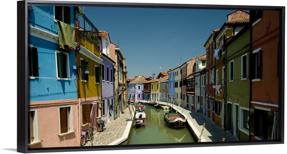 <p>Colorful buildings line either side of a canal in Italy.</p>