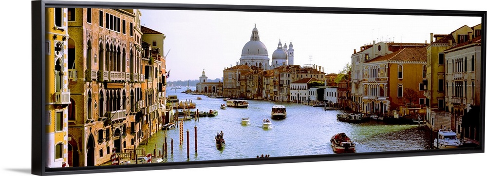 <p>Large panoramic photograph of the busy Grand Canal in Santa Maria della Salute, Venice, Veneto, Italy. Old buildings line the waterway as boats full of commuters and tourists slowly make their way through the passage on a sunny day.</p>