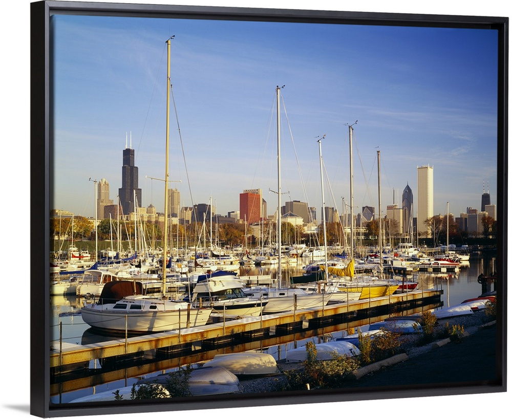 <p>This oversize piece is a picture taken of a line of boats docked in the waterfront near Chicago.</p>
