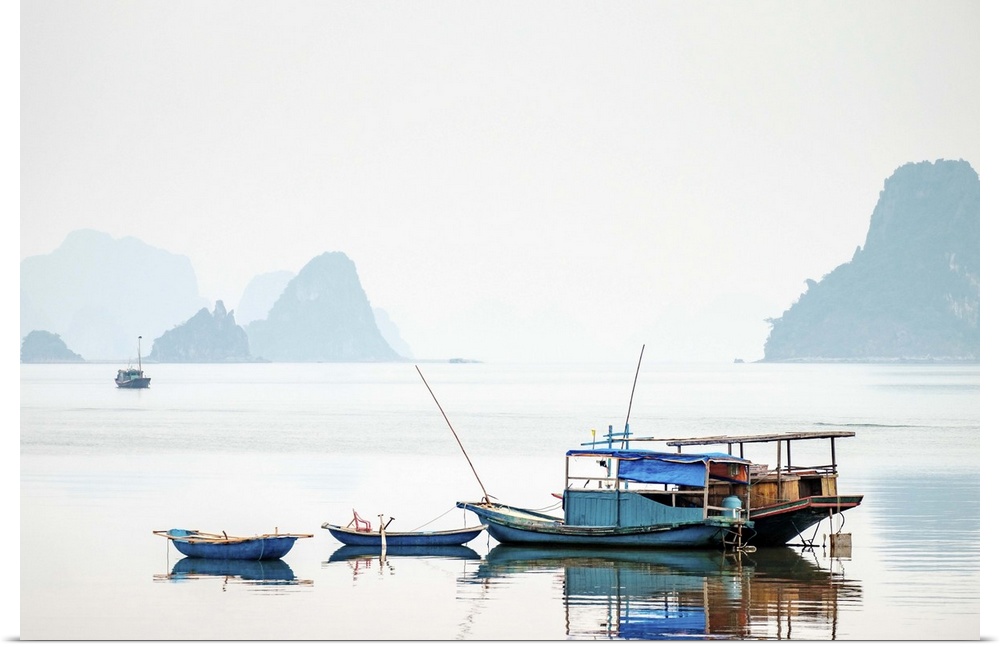 <p>Boats in Bai Tu Long Bay on a foggy day, Cai Rong, Quang Ninh Province, Vietnam.</p>