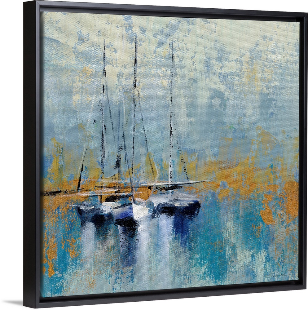 <p>A square abstract painting of sail boats in a harbor in textured brush strokes of blue and gold.</p>