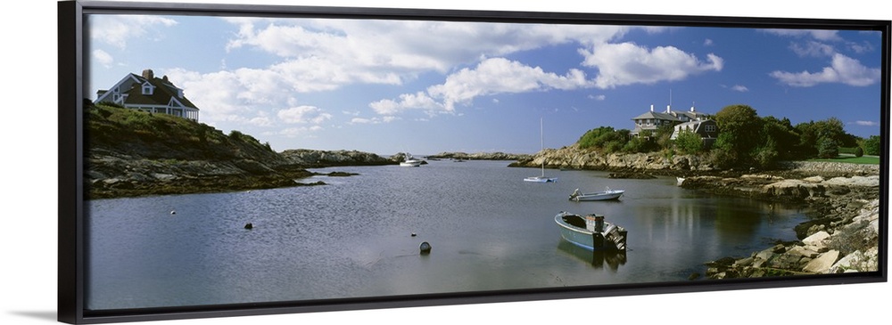 <p>Panoramic photograph on a big canvas of several small boats in ocean water, surrounded by rocky landscape on both sides, with large houses near the shore.</p>