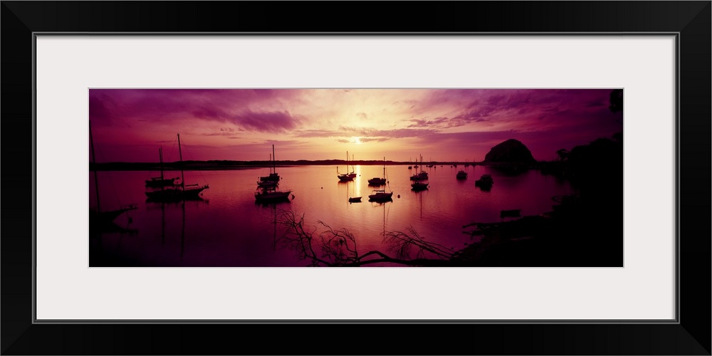 <p>Several boats sit in a bay off of the California coast as the sun starts to set off in the distance and casts a purple shade that reflects in the water.</p>