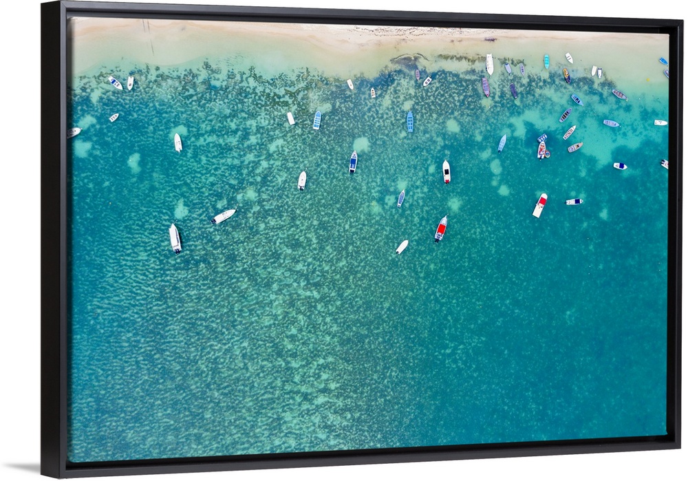 <p>Aerial by drone of boats in the turquoise water of lagoon front of Mont Choisy beach, north-west coast, Mauritius, Indian Ocean, Africa</p>
