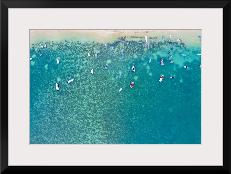 <p>Aerial by drone of boats in the turquoise water of lagoon front of Mont Choisy beach, north-west coast, Mauritius, Indian Ocean, Africa</p>