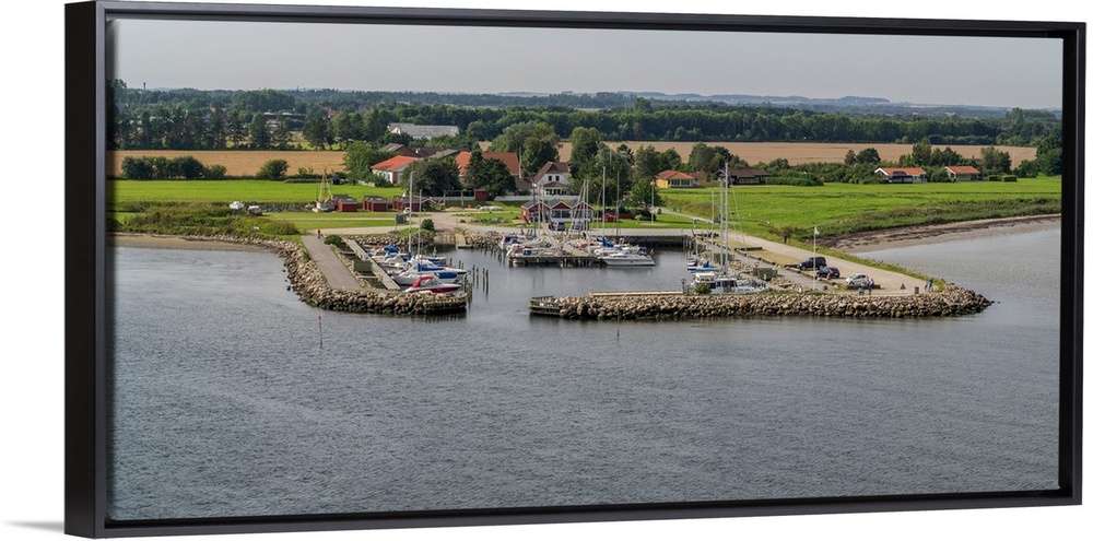 <p>Boats moored at harbor with village in the background, Limfjord, Jutland, Denmark</p>